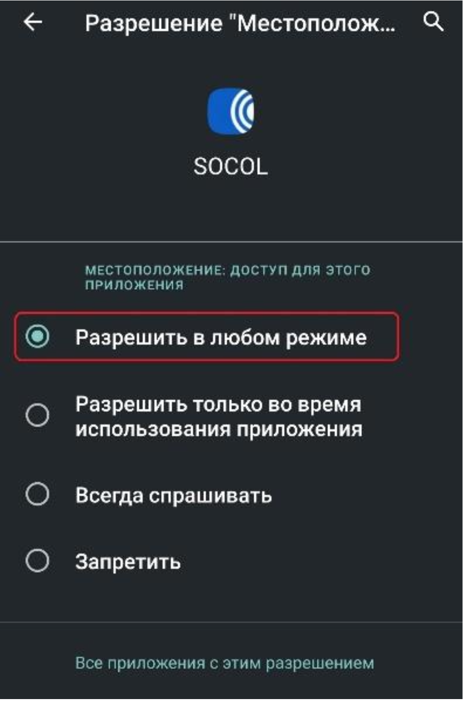 - Разрешение «Местоположение» необходимо дать «Разрешить в любом режиме», иначе работать не будет (в данном случае используется Bluetooth, поэтому приложение не будет получать GPS координаты):